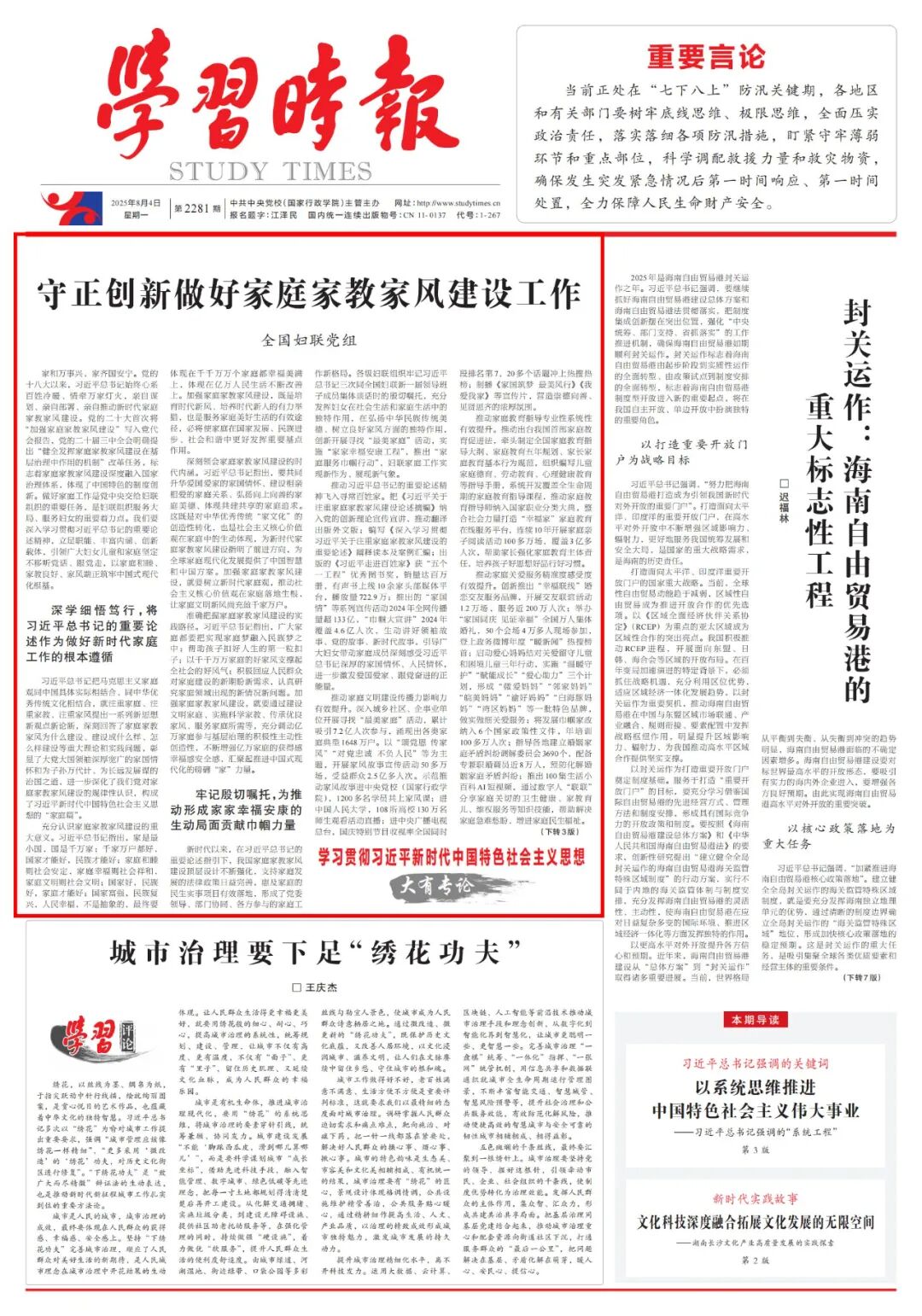 全国妇联党组在2025年8月4日《学习时报》上发表文章《守正创新做好家庭家教家风建设工作》。